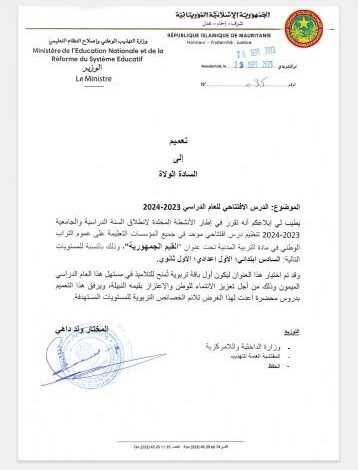 أعلنت وزارة التهذيب الوطني تخصيص الدرس الافتتاحي للعام الدراسي 2023-2024 للحديث عن القيم الجمهورية.\r\n\r\n \r\n\r\nوحسب تعميم صادر عن الوزارة، فقد تقرر تنظیم درس افتتاحي موحد في جميع المؤسسات التعليمة على عموم التراب الوطني في مادة التربية المدنية تحت عنوان \”القيم الجمهورية، وذلك بالنسبة للمستويات التالية: السادس ابتدائي الأول إعدادي الأول ثانوي، في إطار الأنشطة المخلدة لانطلاق السنة الدراسية والجامعية 2024-2023 \r\n\r\n \r\n\r\nوحسب التعميم قد تم اختيار هذا العنوان ليكون أول باقة تربوية تمنح للتلاميذ في مستهل هذا العام الدراسي الميمون وذلك من أجل تعزيز الانتماء للوطن والاعتزاز بقيمه النبيلة، ويرفق هذا التعميم بدروس محضرة أعدت لهذا الغرض تلائم الخصائص التربوية للمستويات.